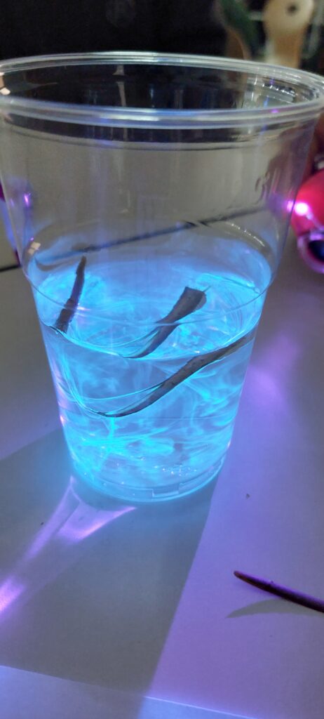 Beeindruckt haben uns am meisten die Geheimnisse frischer Erlen- oder Kastanienzweige, die in klarem Wasser eine Substanz abgeben, die nur unter UV Licht sichtbar gemacht werden kann.